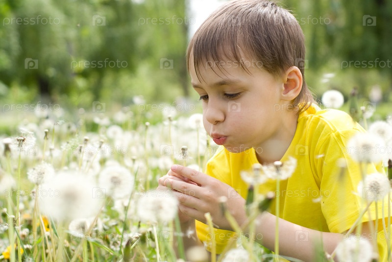 Мальчик сидит на поляне и дует на одуванчик