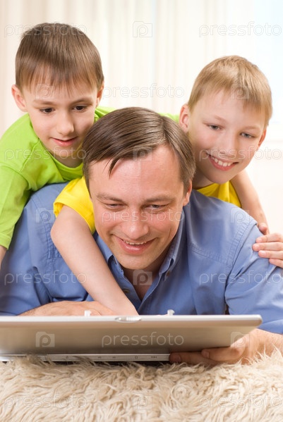 Отец с сыновьями и ноутбуком дома