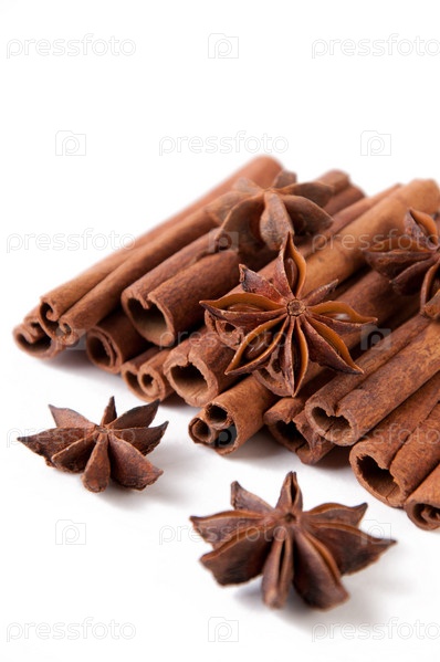 Палочки корицы и анисовые звездочки на белом фоне