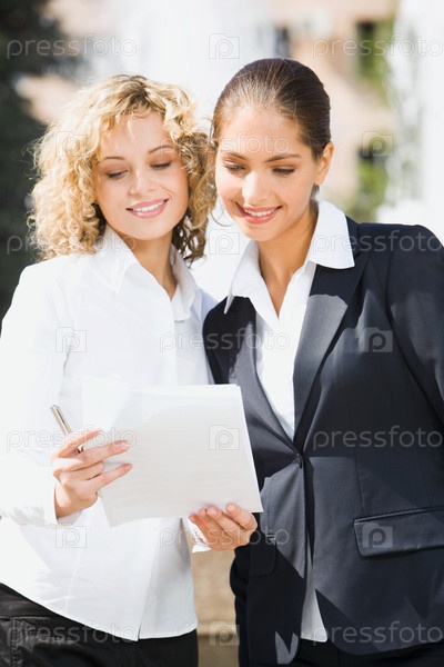Две милые улыбающиеся студентки, стоящие снаружи перед фонтаном и читающие документы