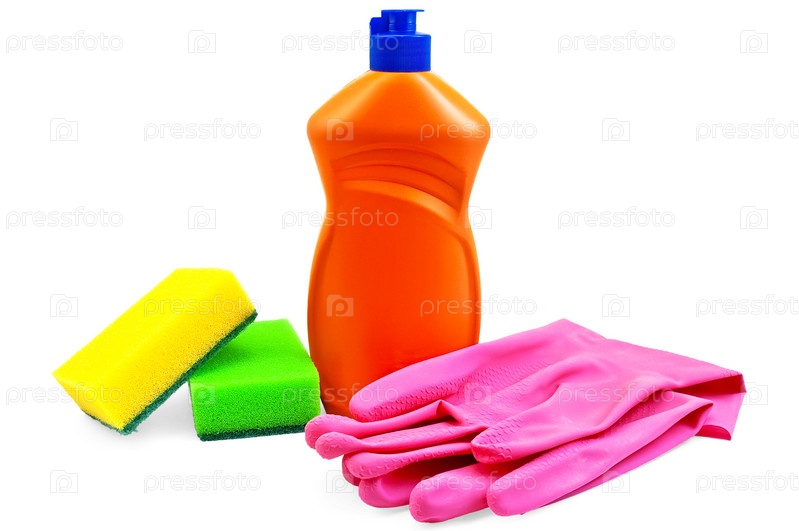 Оранжевая бутылка с моющим средством, розовые резиновые перчатки и две губки на белом фоне