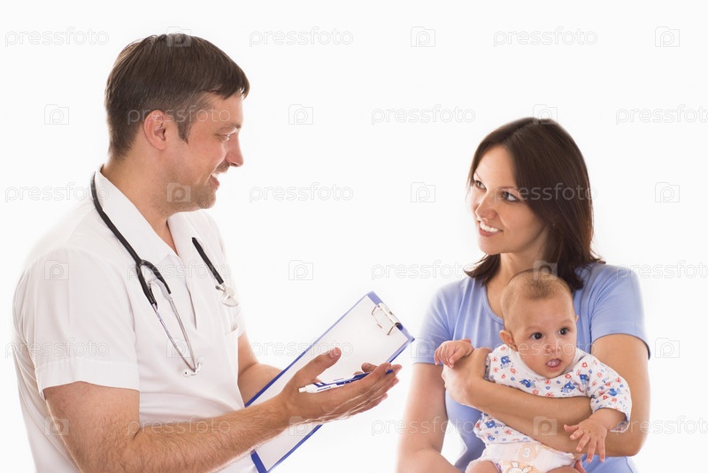 Доктор и женщина с новорожденным ребенком на белом фоне