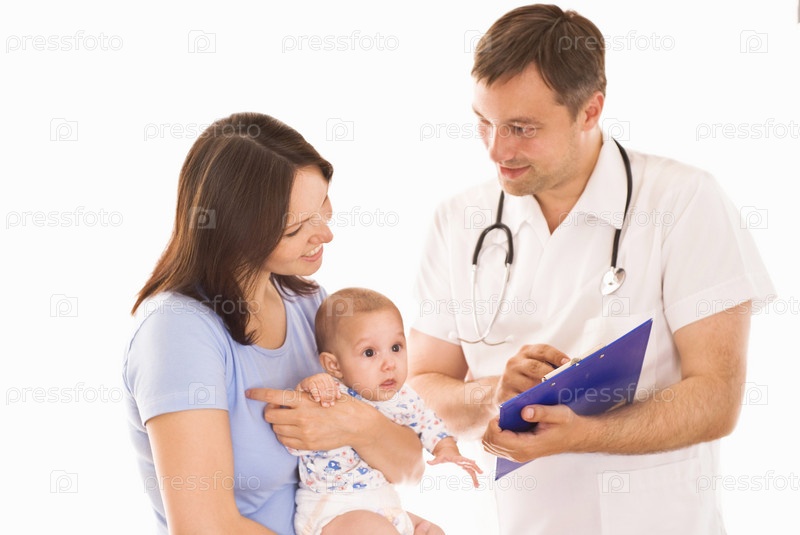 Доктор и женщина с новорожденным ребенком на белом фоне