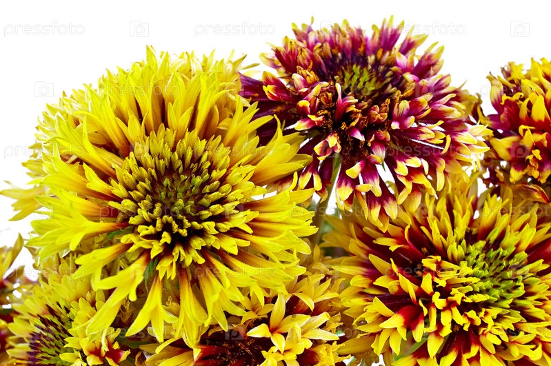 Букет из желтых и фиолетовых цветов гайлардии на белом фоне