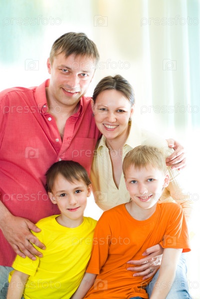 Портрет счастливой семьи из четырех человек на светлом фоне