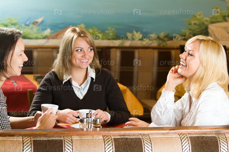 Три молодых женщины разговаривают за столом в кафе