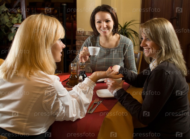 Три молодых женщин разговаривают за столом в кафе
