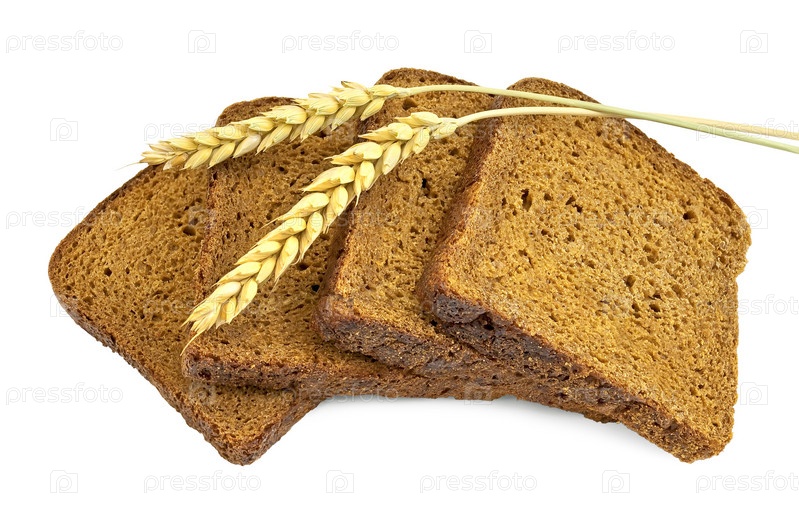 Четыре ломтика ржаного хлеба и пшеница на белом фоне