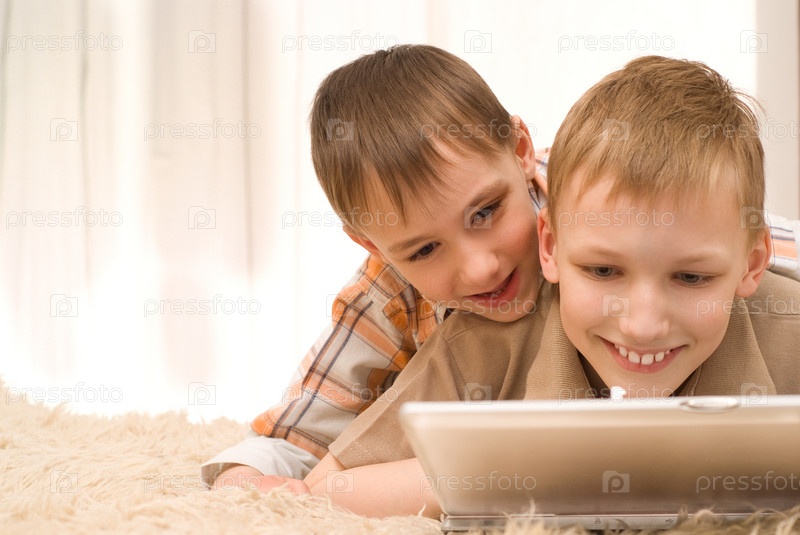 Братья лежат на ковре с ноутбуком