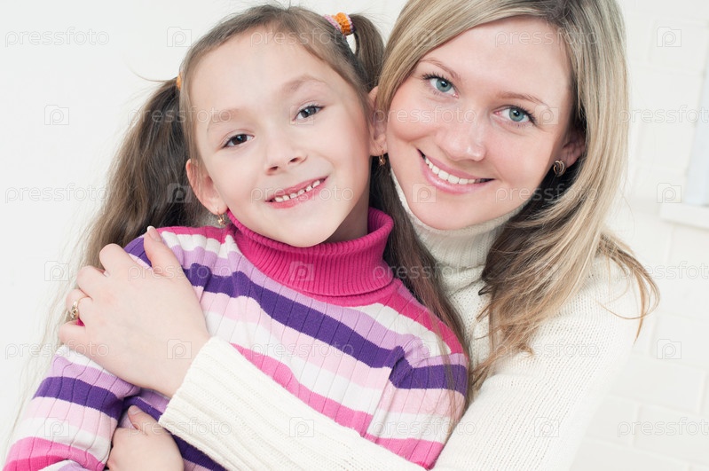 Молодая женщина обнимает свою дочь, улыбается и смотрит в камеру
