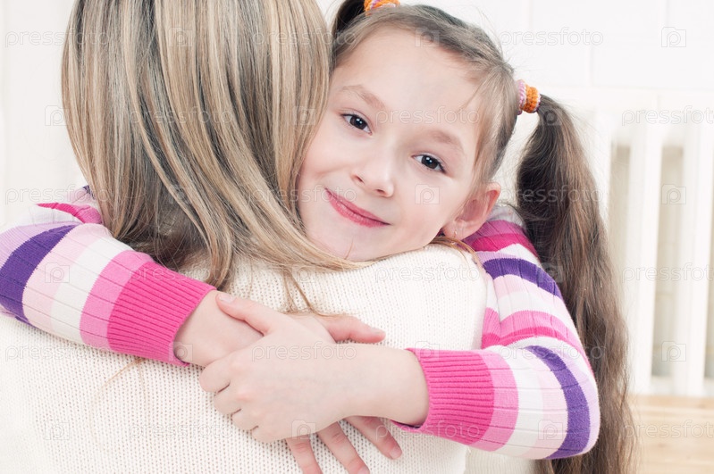 Маленькая девочка обнимает маму за шею, улыбается и смотрит в камеру