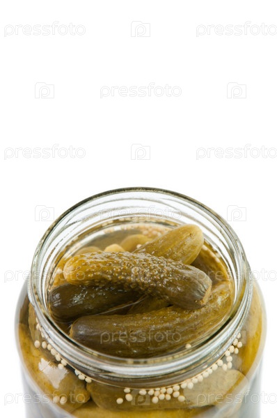 Банка соленых огурцов на белом фоне, место для текста