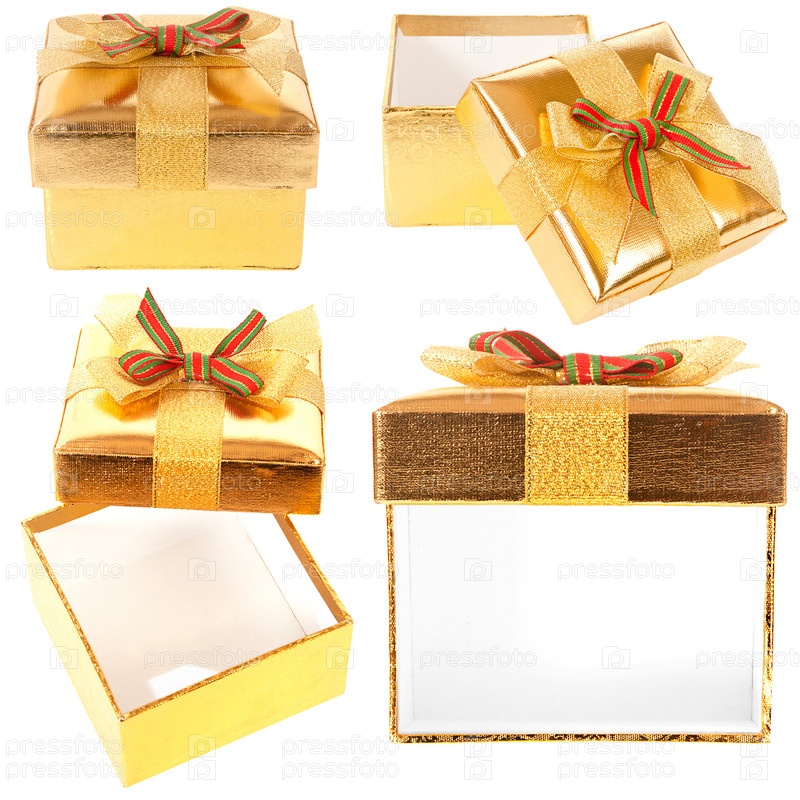 Набор золотых подарочных коробок на белом фоне