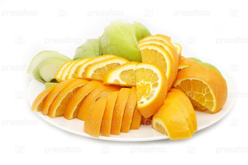 Ломтики яблока и апельсина на белом фоне