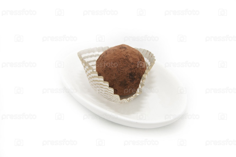 Шоколадный трюфель в бумажной юбочке, белый фон