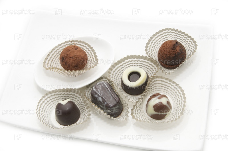 Шоколадные конфеты в бумажных юбочках, белый фон
