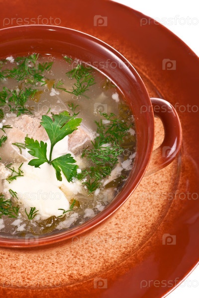 Суп из говядины, заправленный сметаной и свежей зеленью