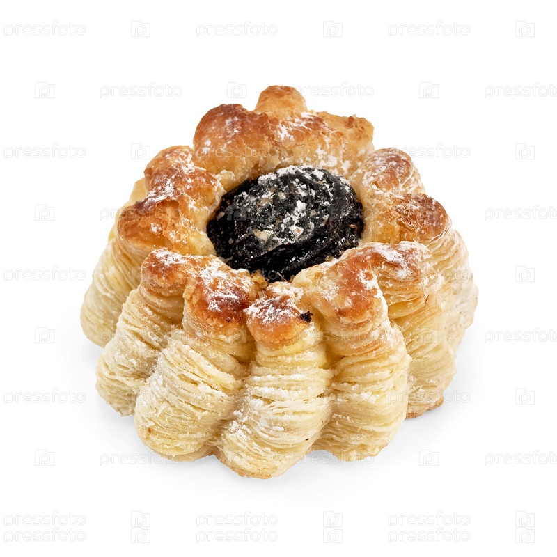 Слоеная булочка с черносливом и сахарной пудрой, изолированная на белом фоне