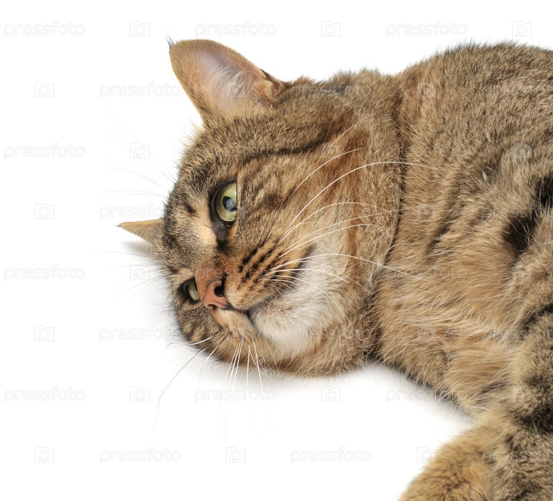 Кошка лежит на белом фоне