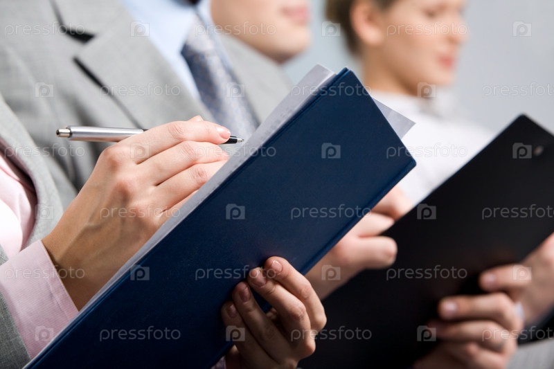 Папка в руках конспектирующего делового человека на семинаре по бизнесу