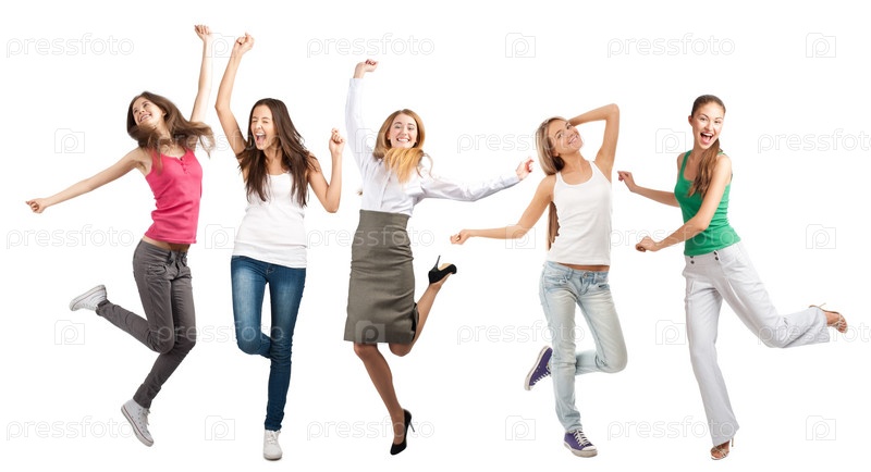 Группа веселых молодых женщин прыгают и танцуют на белом фоне