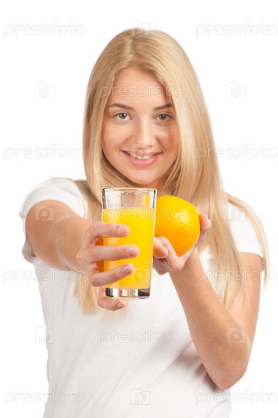 Молодая женщина с апельсином и стаканом сока на белом фоне
