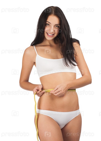 Молодая красивая женщина в белом белье измеряет талию сантиметром