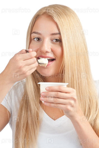 Молодая красивая женщина в белой футболке ест йогурт на завтрак, изолированная на белом фоне