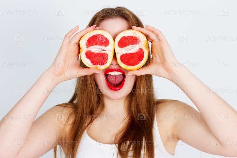 Портрет молодой женщины с красным грейпфрутом