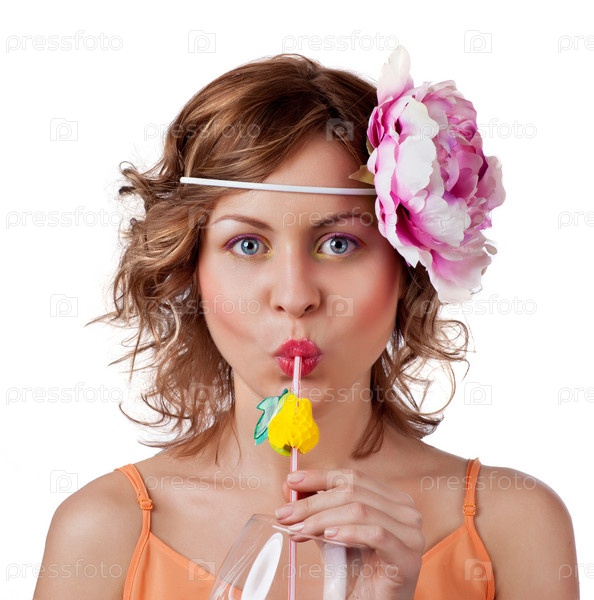 Симпатичная женщина потягивает апельсиновый сок