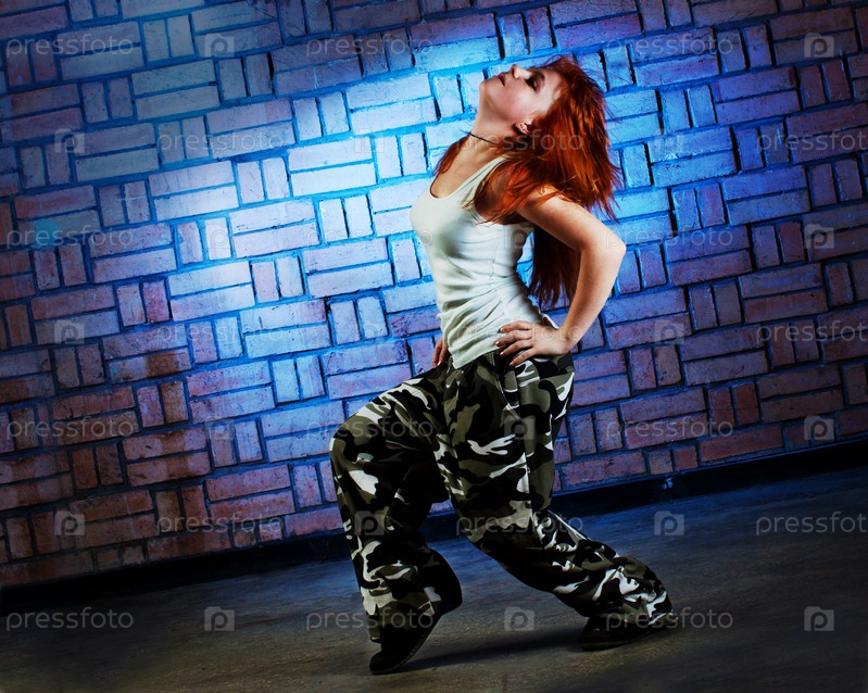 Девушка танцует хип-хоп на фоне синей кирпичной стены