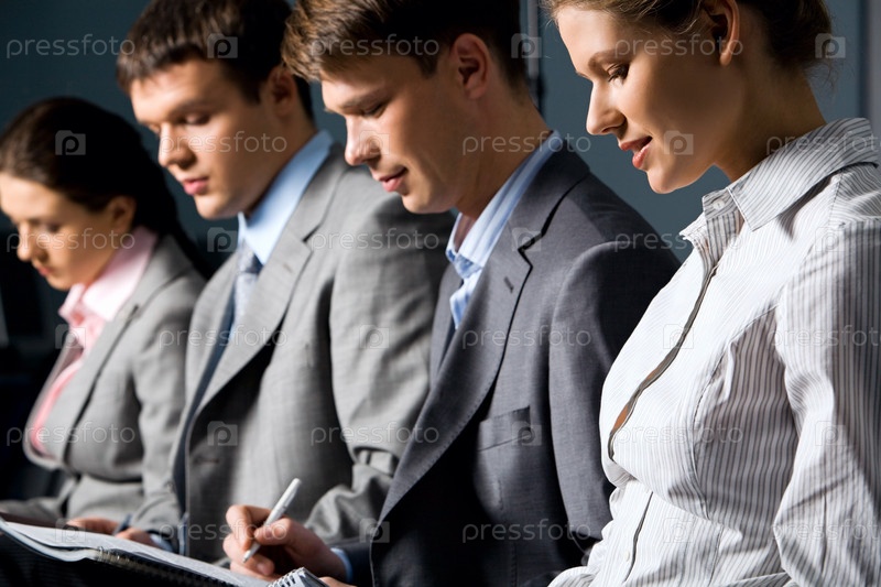 Портрет деловых людей, пишущих текст на семинаре вечером