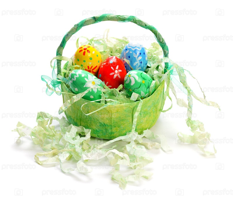 Пасхальные яйца в корзине на белом фоне