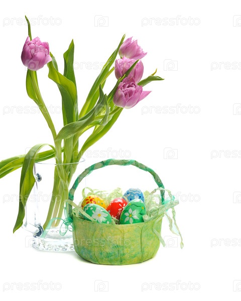 Пасхальные яйца в корзине и тюльпаны на белом фоне