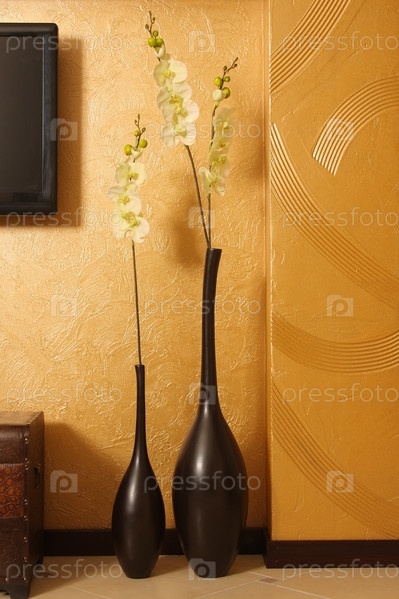 Фрагмент интерьера с двумя вазами с орхидеями на стене, украшенной декоративным штукатуркой
