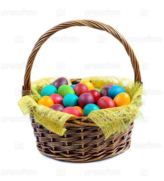 Корзина пасхальных яиц на белом фоне