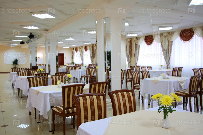 Большое просторное кафе с набором столов