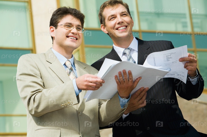 Два бизнесмена, держащие бумаги, смотрят в сторону и делового центра со стеклянными стенами на заднем плане
