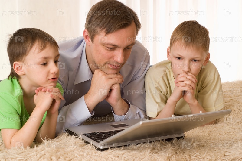 Отец с двумя сыновьями и ноутбуком