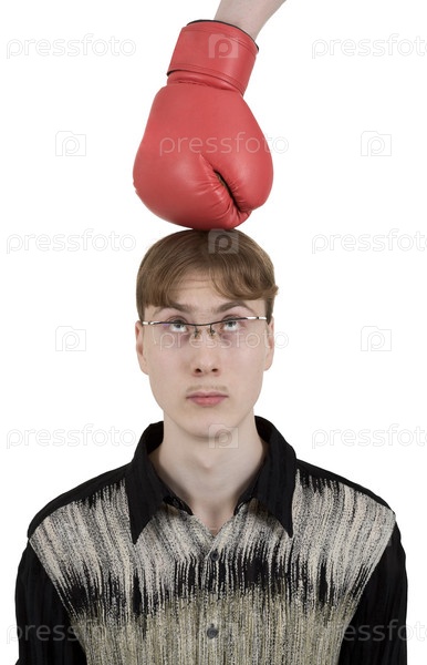 Человек и красная боксерская перчатка на белом фоне