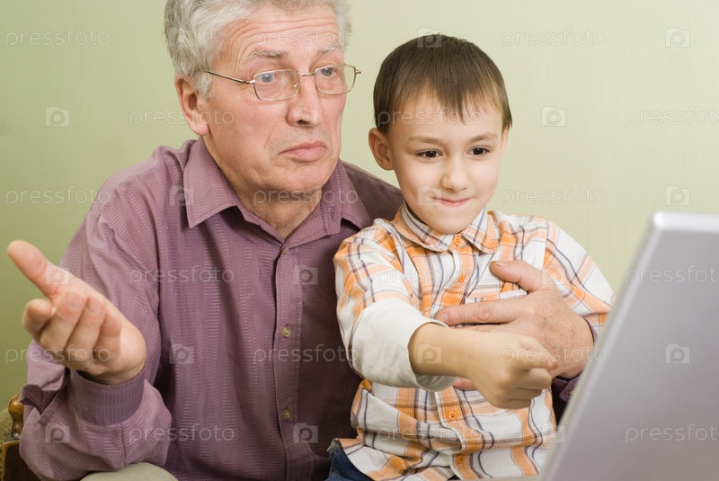 Дедушка с внуком играют на компьютере