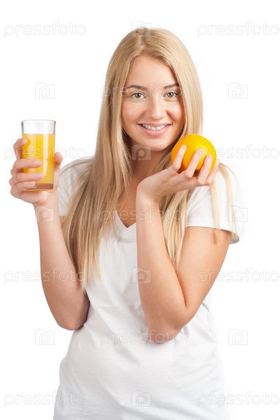 Девушка со стаканом апельсинового сока и апельсином на белом фоне
