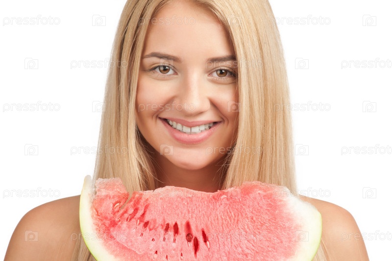 Портрет молодой красивой женщины с ломтиком свежего арбуза