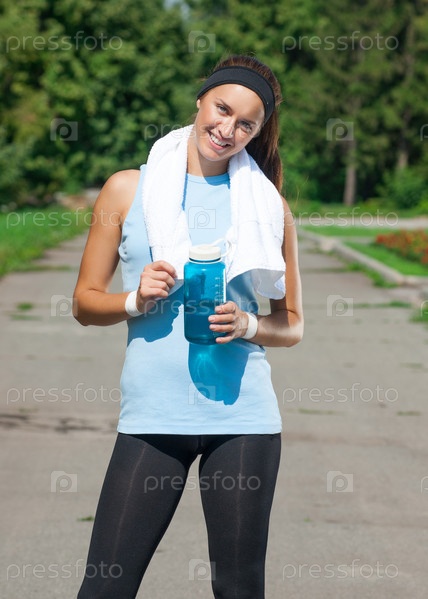 Стройная девушка с полотенцем и бутылкой воды стоит в парке летом