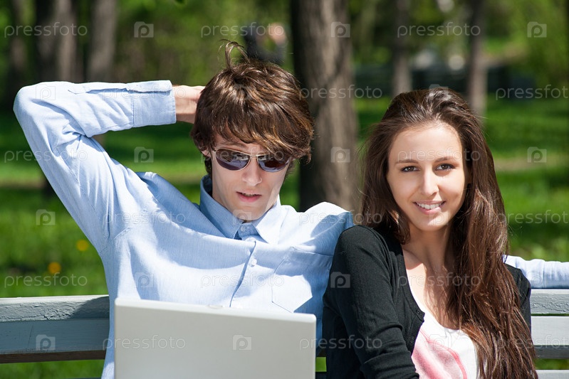 Красивая молодая пара сидит с ноутбуком на скамье в парке