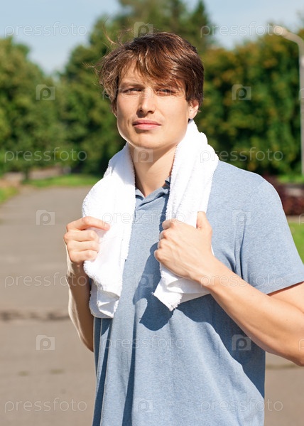 Молодой человек с белым полотенцем после пробежки в парке