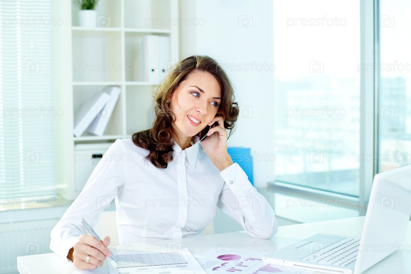 Бизнес-леди разговаривает по телефону на рабочем месте