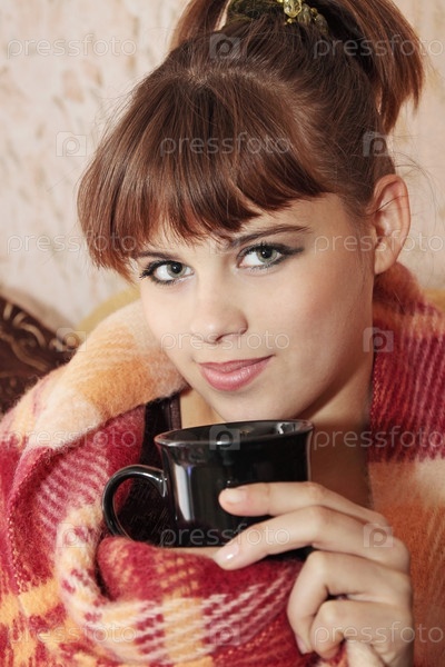 Девушка, завернутая в плед с чашечкой чая