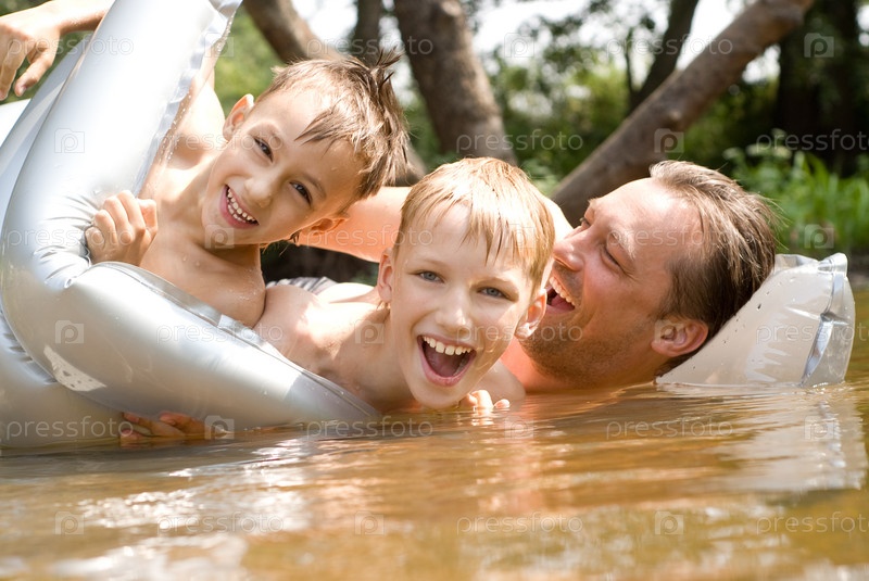 Счастливый отец и сыновья в речке