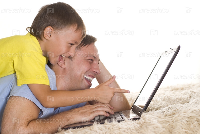 Счастливый отец и сын с ноутбуком
